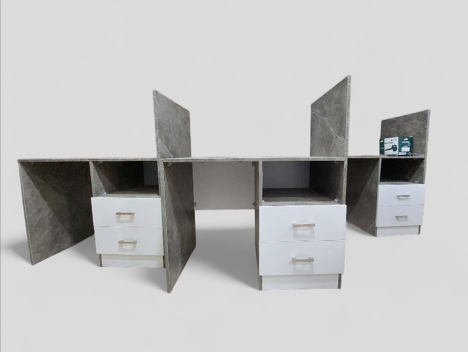 * فاصل جانبي مميز: يتميز المكتب بفاصل رأسي (قد يكون من المعدن أو الخشب الداكن كما يظهر في الصورة) يضيف لمسة تصميم فريدة، ويوفر خصوصية بصرية جزئية، ويساعد في تحديد مساحة العمل الخاصة بك.
